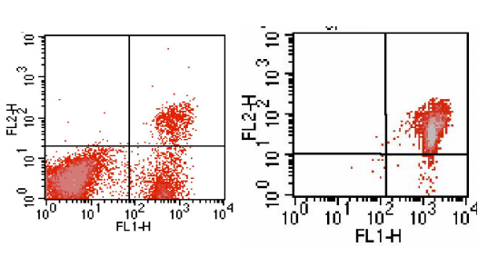 CMV特异性T细胞被Epimer单体纯化,分离,并与滋养细胞共培养8天。 用抗CD8-FITC和CMV/Epimer共染色,流式细胞仪分析(右图)。